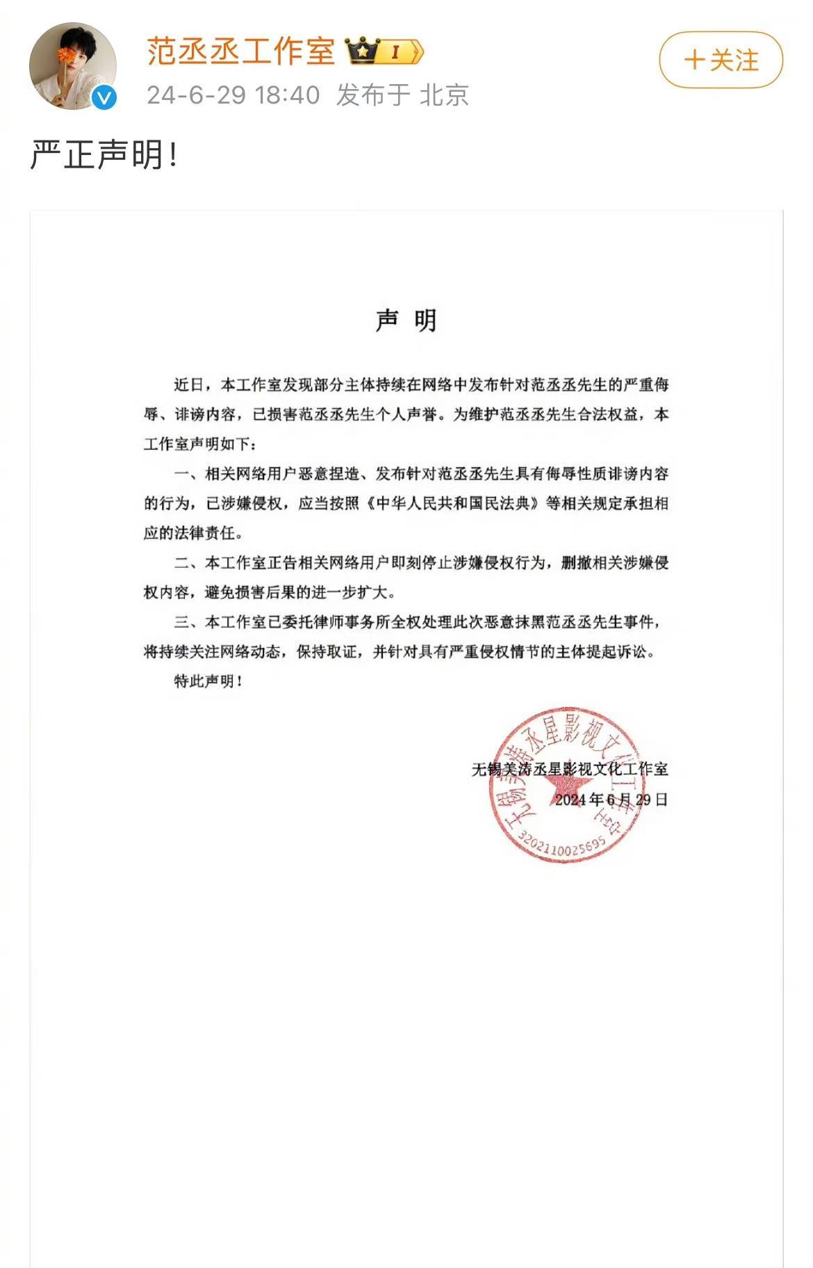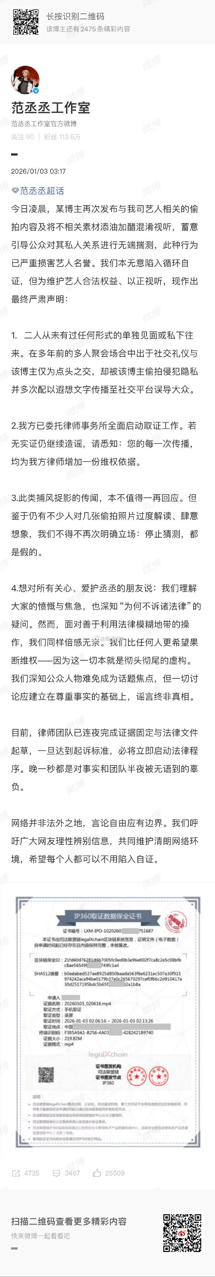 这场风波也撕开了内娱声明公信力的裂痕。对比黄子韬否认恋情后官宣结婚、田栩宁称单身却被拍同居的“反转戏码”,范丞丞工作室的回应显得尤为真诚。声明里那句“半夜被无语到的辜负”,道尽了被造谣的愤怒与无奈,没有套话连篇,反而让公众感受到真实的情绪。随着鹿晗、林更新等工作室集体跟进维权,司晓迪账号最终被永久封禁,这场闹剧以造谣者付出代价收场。 在流量至上的时代,明星隐私屡遭侵犯,范丞丞工作室的强硬态度无疑给行业树立了标杆:面对造谣,沉默就是纵容,唯有法律武器才能守护底线。而网友们的支持也印证了——清朗网络空间,需要每个人对谣言说“不”。